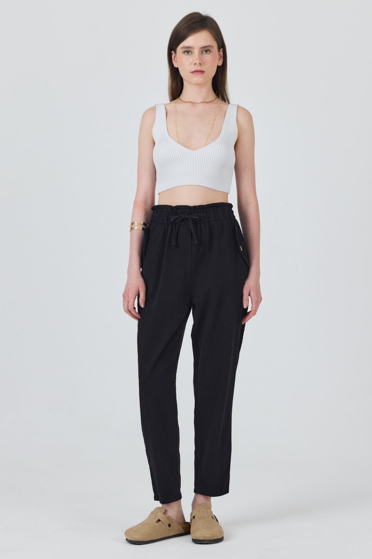 Siyah Cep Düğme Detaylı Bel Lastikli Pantolon 006