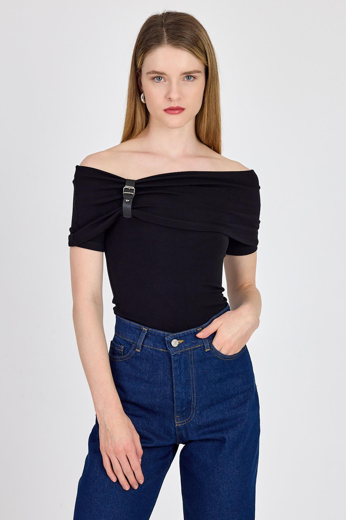 Siyah Viskoz/Yumuşak Kumaş Madonna Yaka Toka Detaylı Bluz 1475