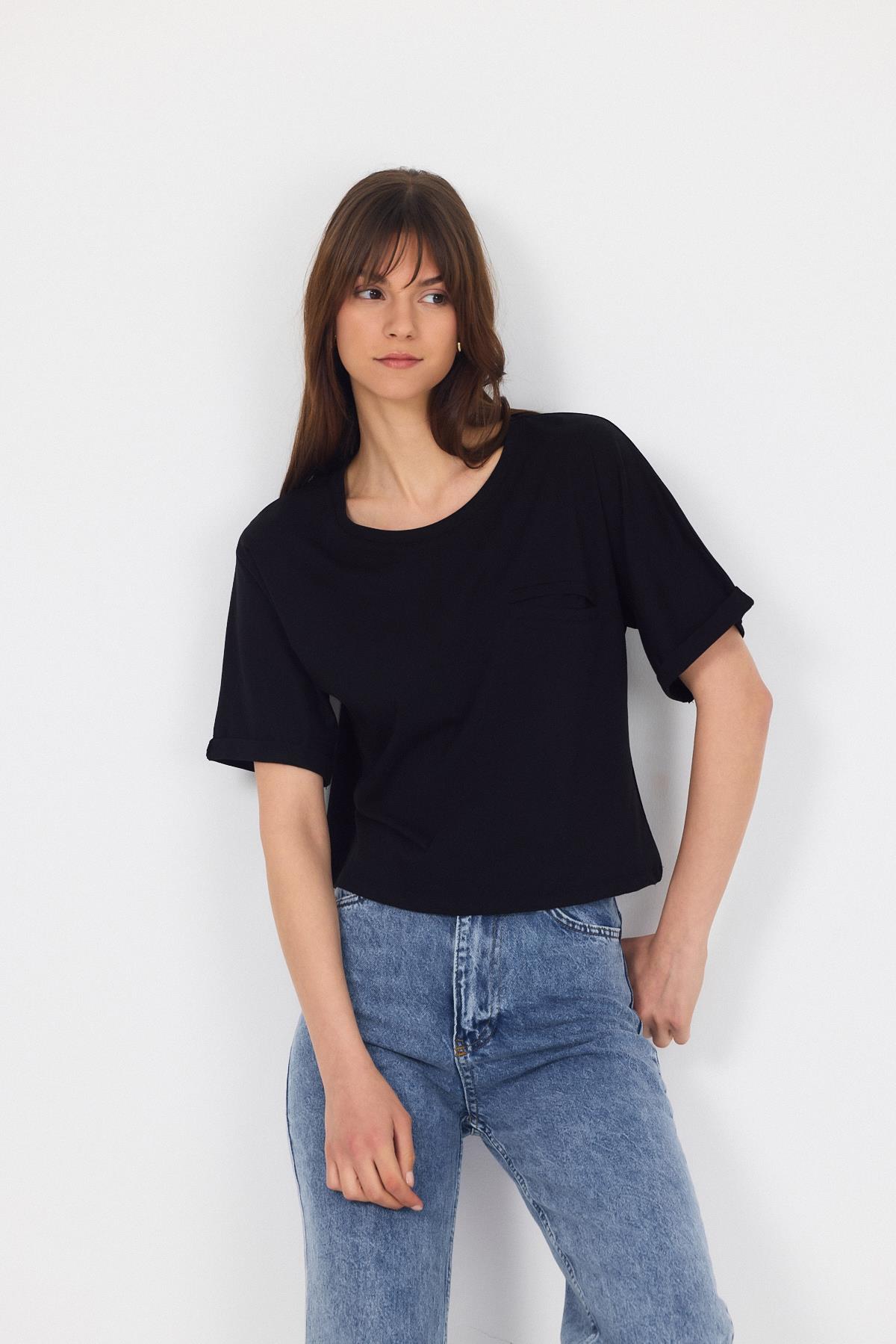 Siyah Sahte Cep Detaylı Bisiklet Yaka Crop Tişört 2136M