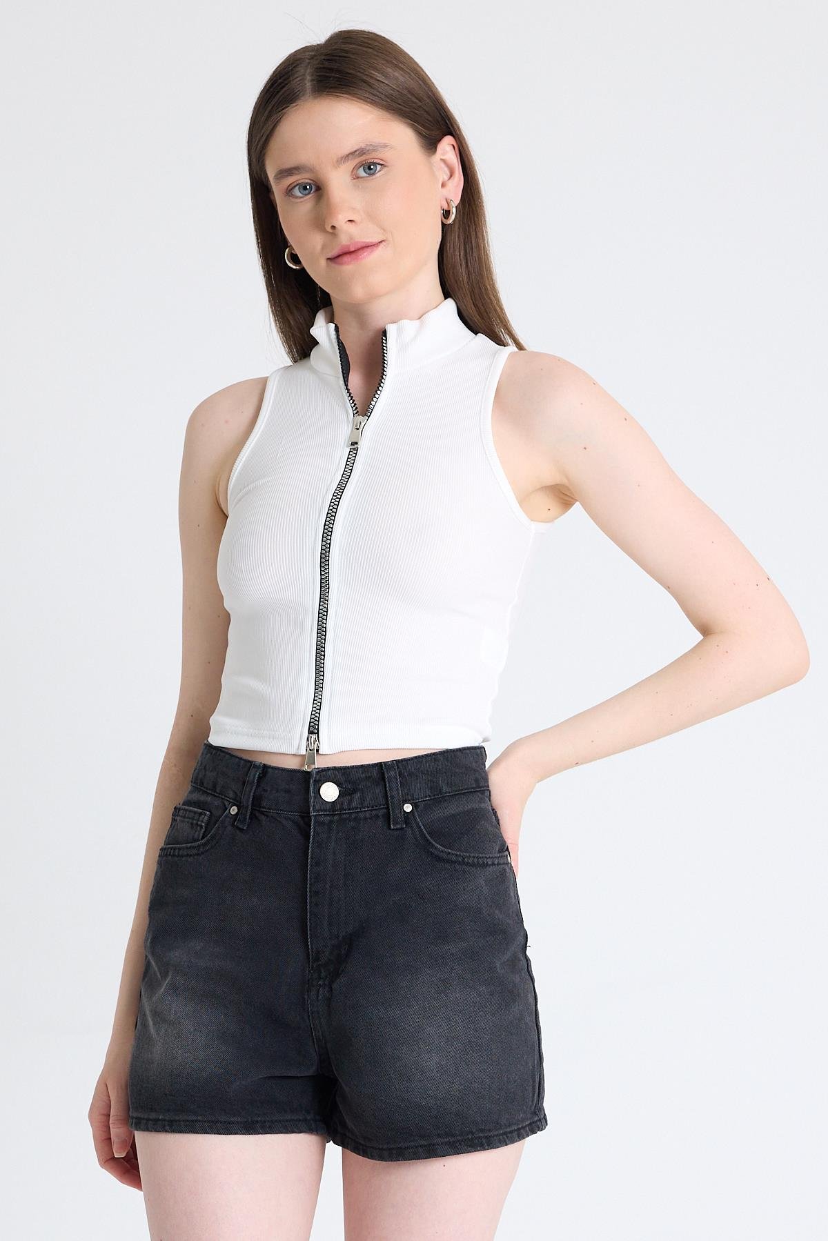 Beyaz Fermuar Detaylı Kolsuz Crop Bluz 2226