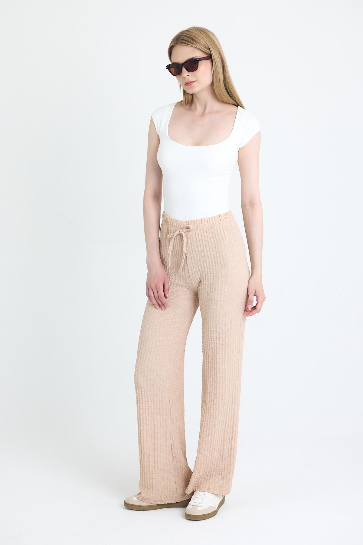 Bej Geniş Paça Dökümlü Bürümcük Kumaş Pantolon 326