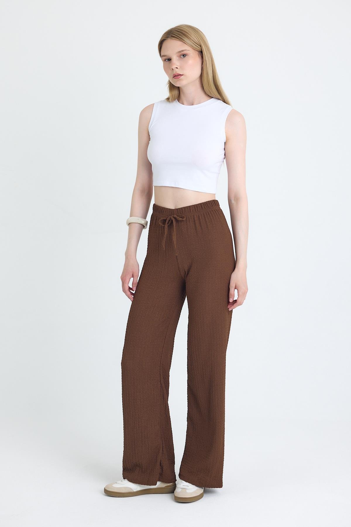 Kahve Geniş Paça Dökümlü Bürümcük Kumaş Pantolon 326