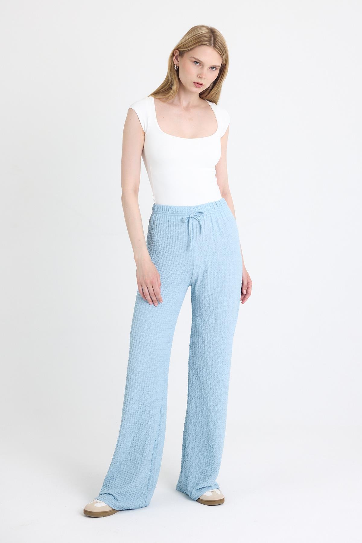 Mavi Geniş Paça Dökümlü Bürümcük Kumaş Pantolon 326