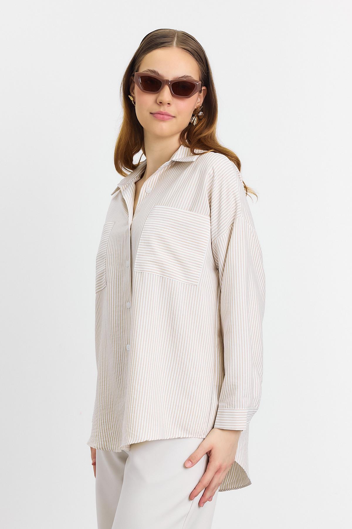 4294A Çizgili Cepli Gömlek Bej