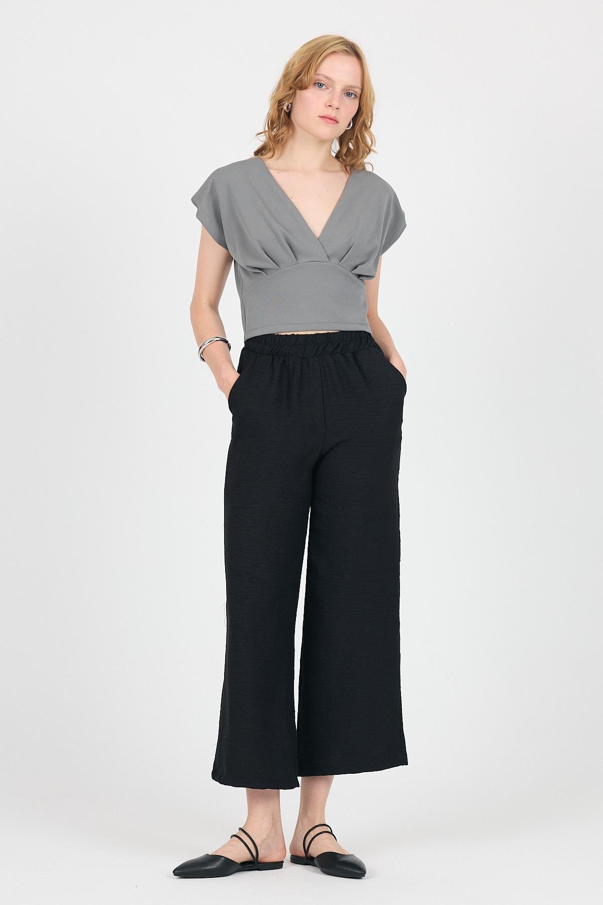 Siyah Pamuklu Bel Lastikli Bol Paça Pantolon 4657