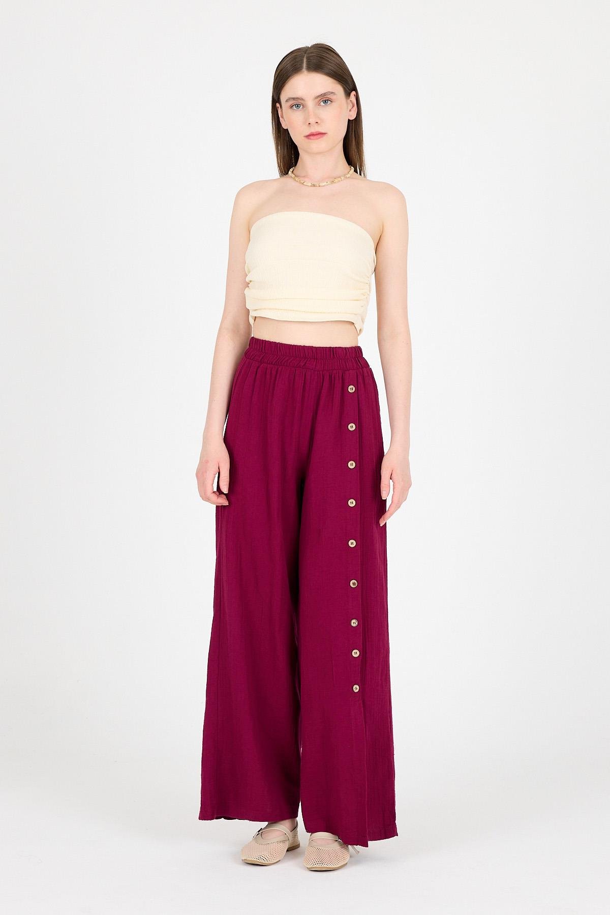 Bordo %100 Pamuk Müslin Yanı Düğmeli Yırtmaçlı Geniş Paça Pantolon 4704A