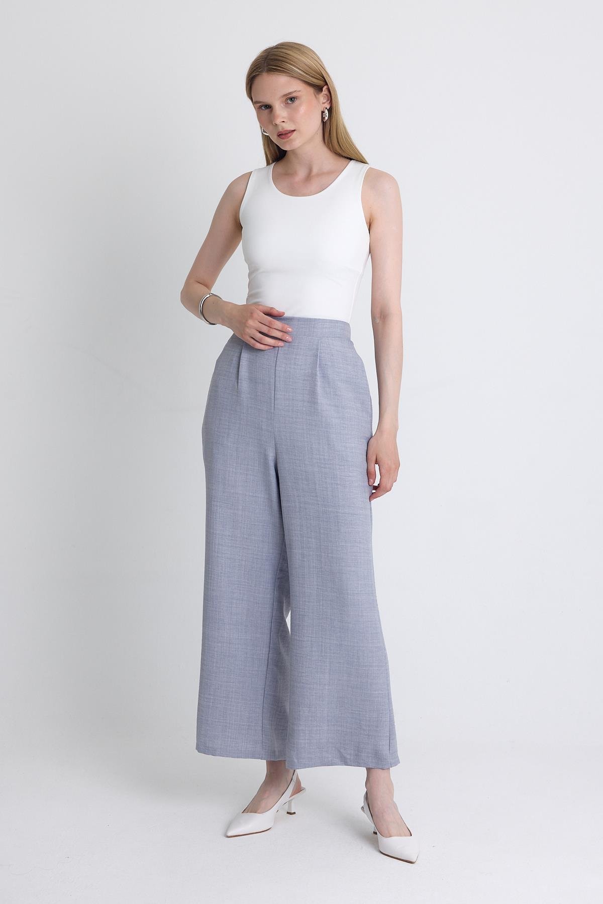 Gri Yüksek Bel Ön Pile Detaylı Pamuklu Bol Paça Pantolon 8014A