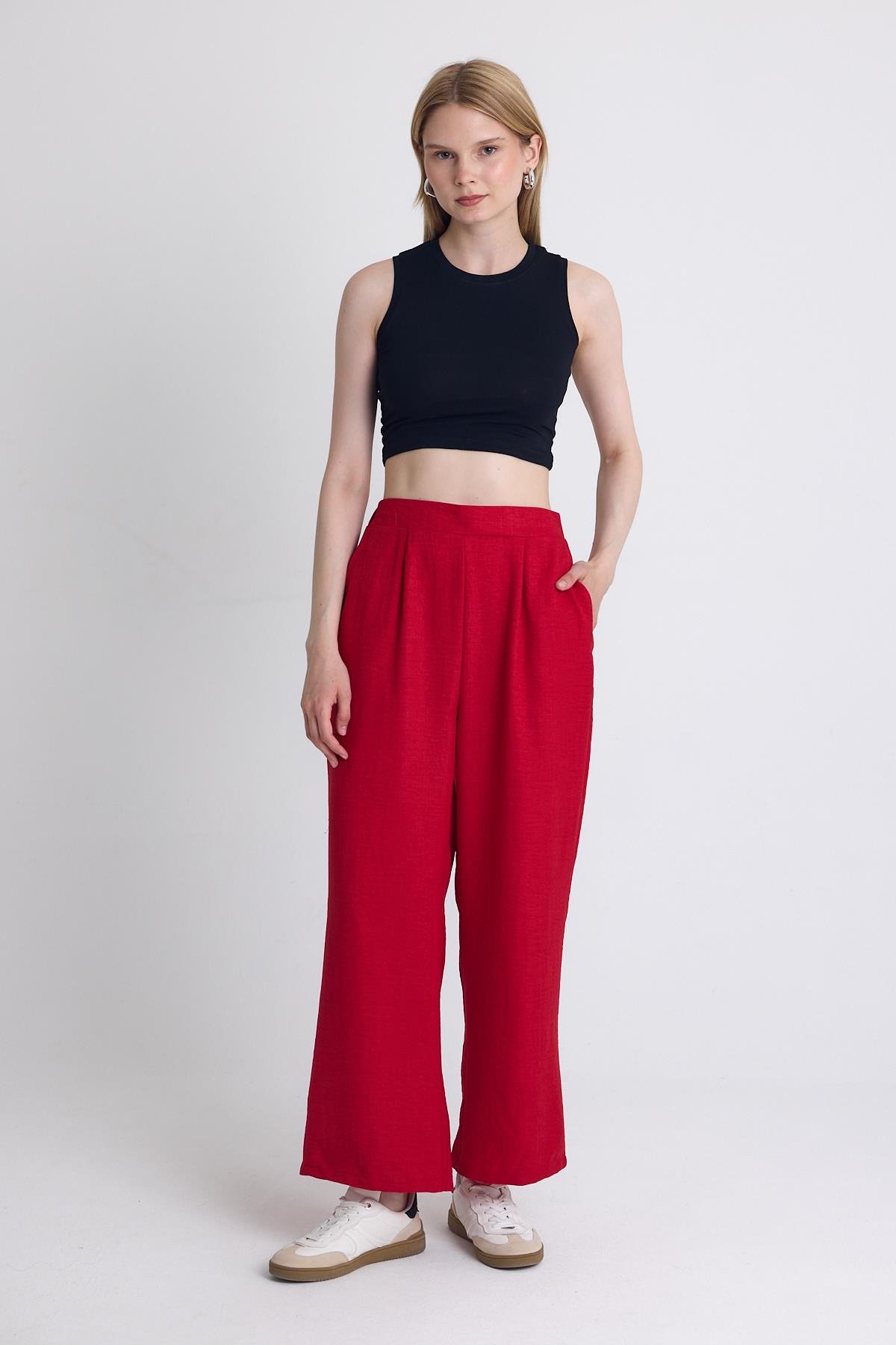 Kırmızı Yüksek Bel Ön Pile Detaylı Pamuklu Bol Paça Pantolon 8014A