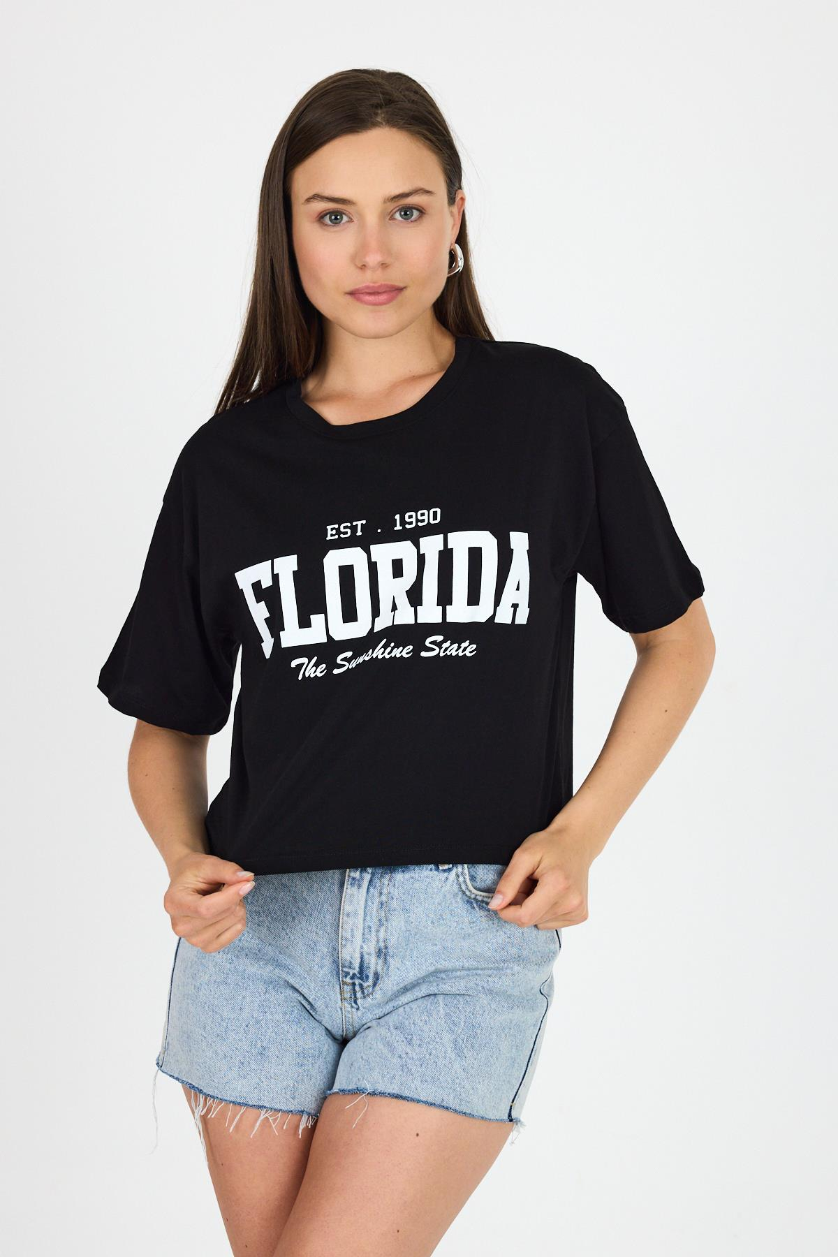 Siyah Yazı Baskılı %100 Pamuk Crop Tişört 9188M